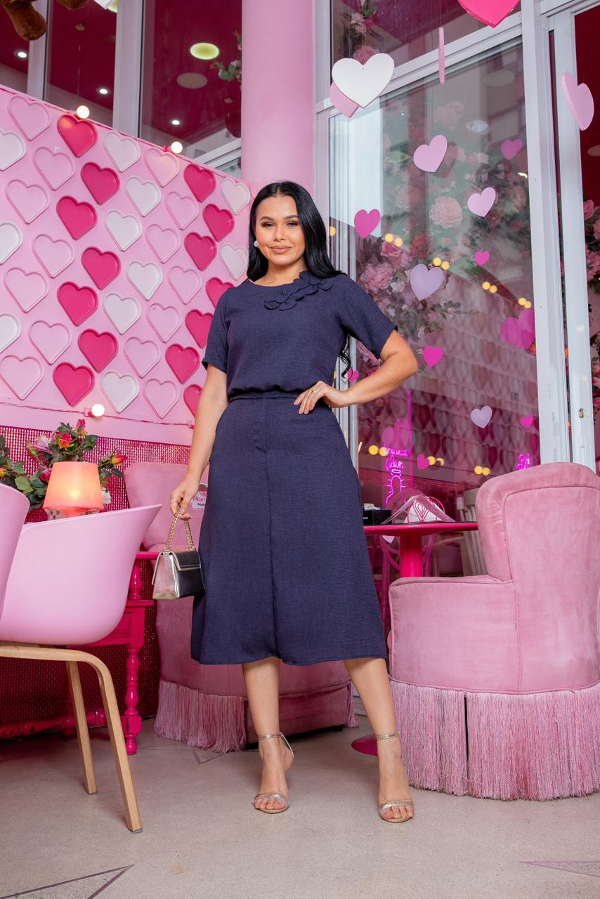 Conjunto de duas peças confeccionado no linho , saia possui zíper e forro blusa tem um flor bordada .